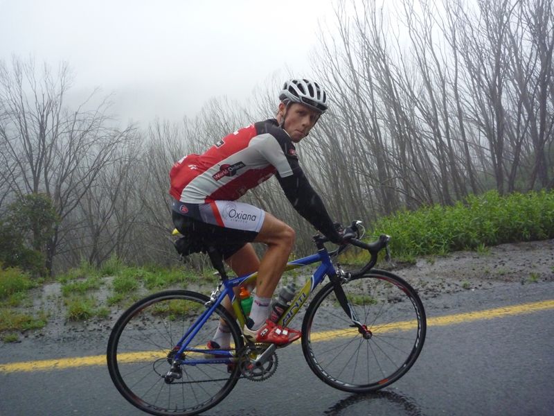As we went up in the vehicles we gradually caught up to each rider, one of whom pulled the pin, but the others who were riding strongly and steadily alone or in groups of 2 or 3. We gave encouragement, took photos (see below) and then wound up the windows to keep the rain out...not to mention the fog and the wind as we went higher. They all rode well, looking strong and smooth - a good ride. Not content, a couple headed out for short (and wet) runs afterwards.